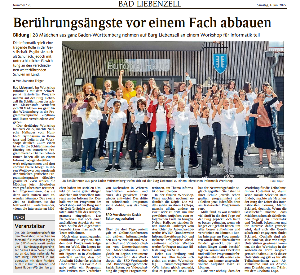 Da der Anteil der Mädchen bei diesem bewährten Format immer sehr gering ist, wurde im Jahr 2022 gezielt ein Programm zur Mädchenförderung aufgelegt. Dafür wurden erfolgreiche Teilnehmerinnen des Jugendwettbewerbs Informatik eingeladen. Da die Bewerberinnenlage hoch war, wurden mit den 28 Teilnehmerinnen deshalb auch 3 Mädchen mehr als ursprünglich geplant zugelassen.